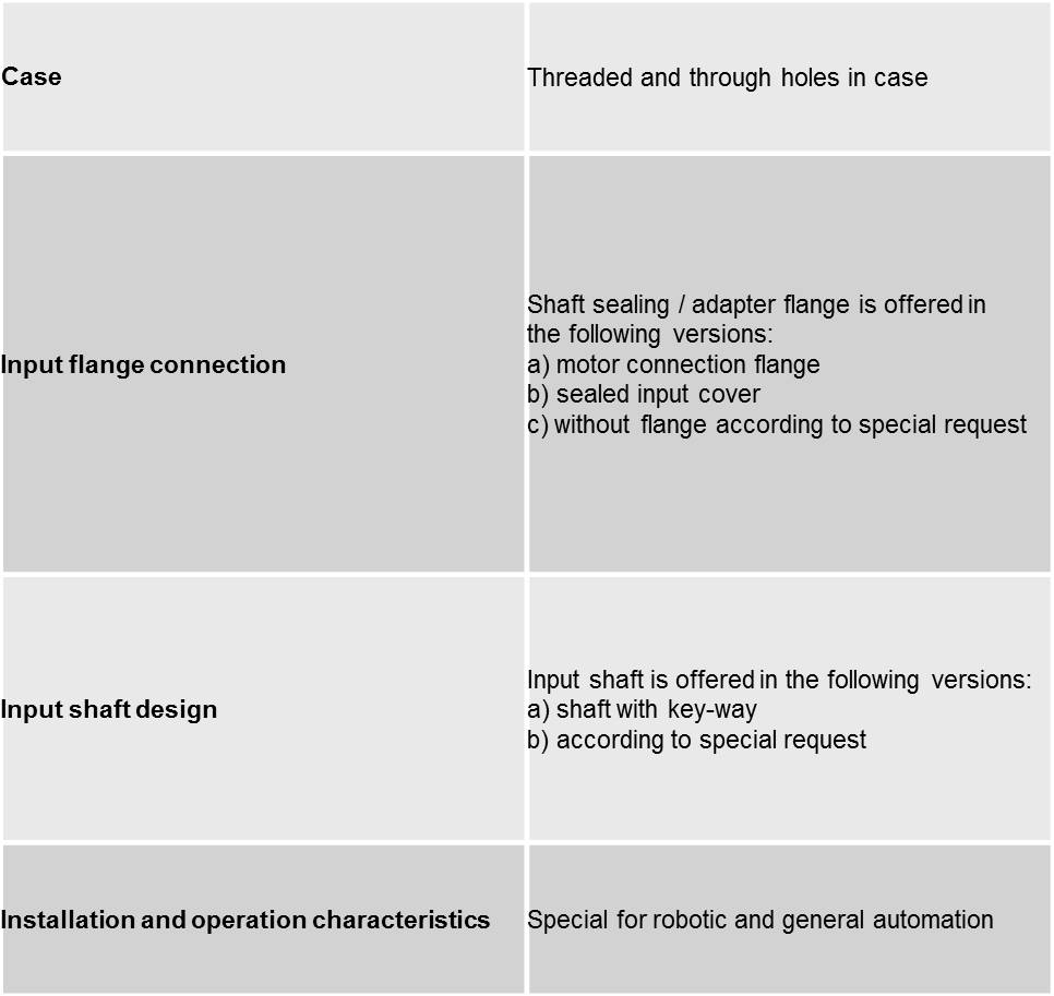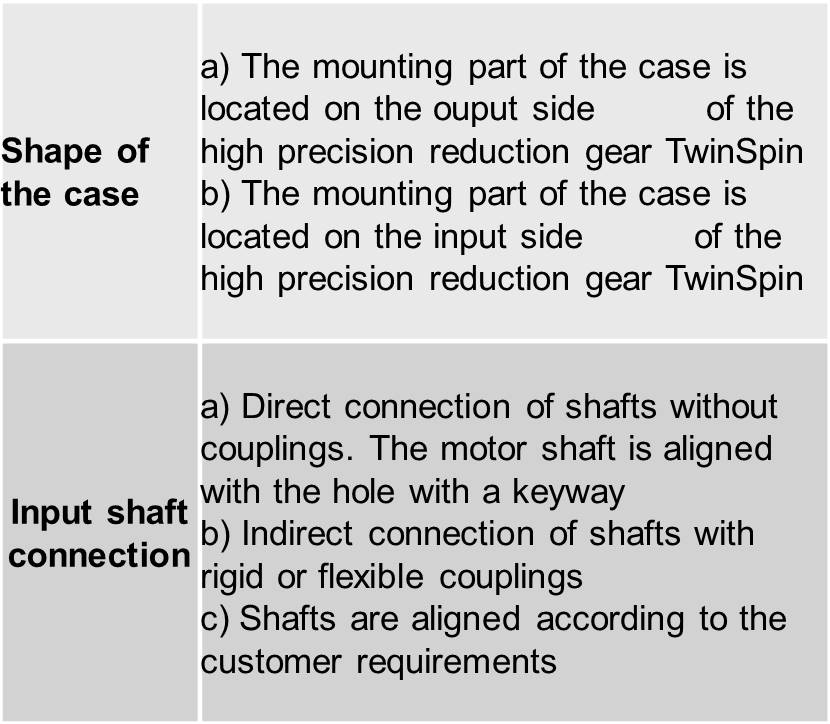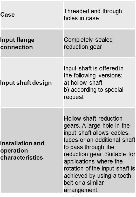 The M series high precision reduction gears are manufactured in several modifications according to the specification of the shaft and the case.